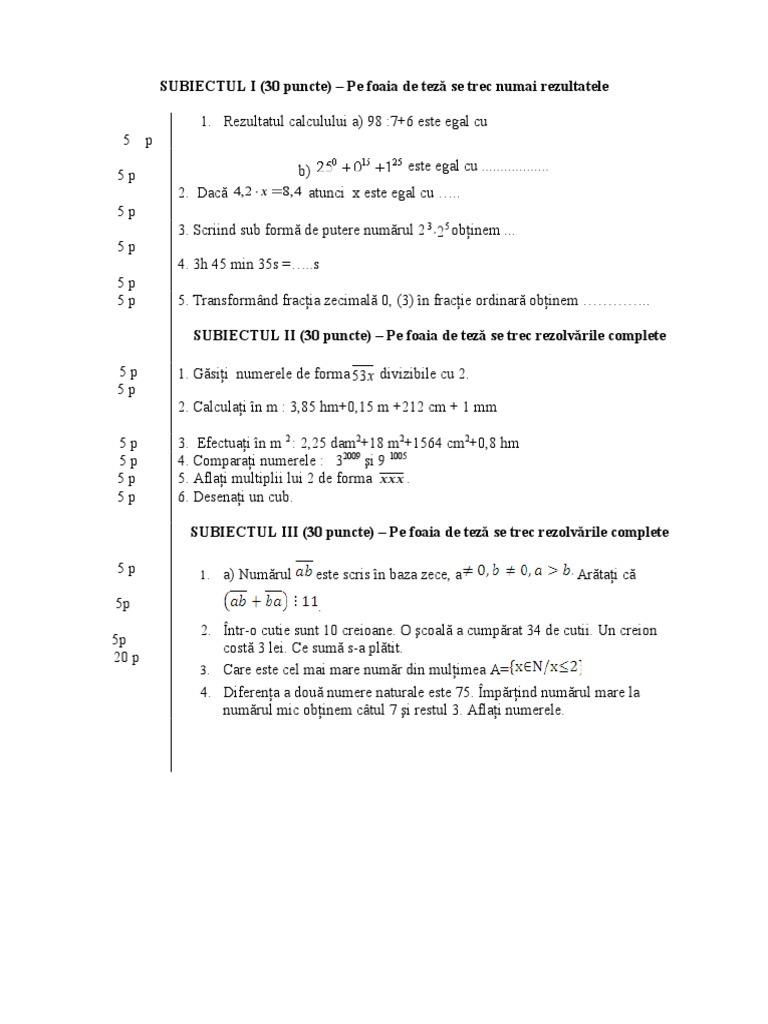 Test De Evaluare Finala La Matematica Clasa 5 Ces