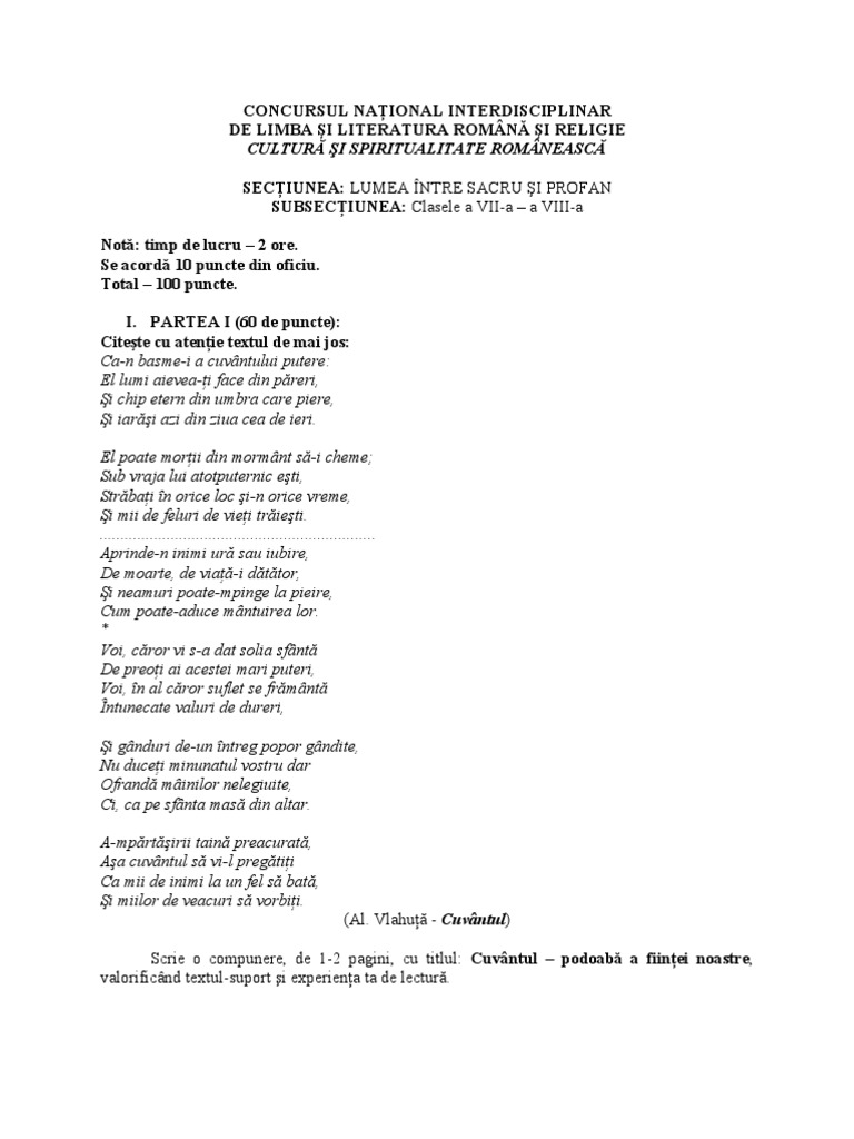 Concurs Cultura Si Spiritualitate Subiecte 2013 Cls 7 8 Pdf Document