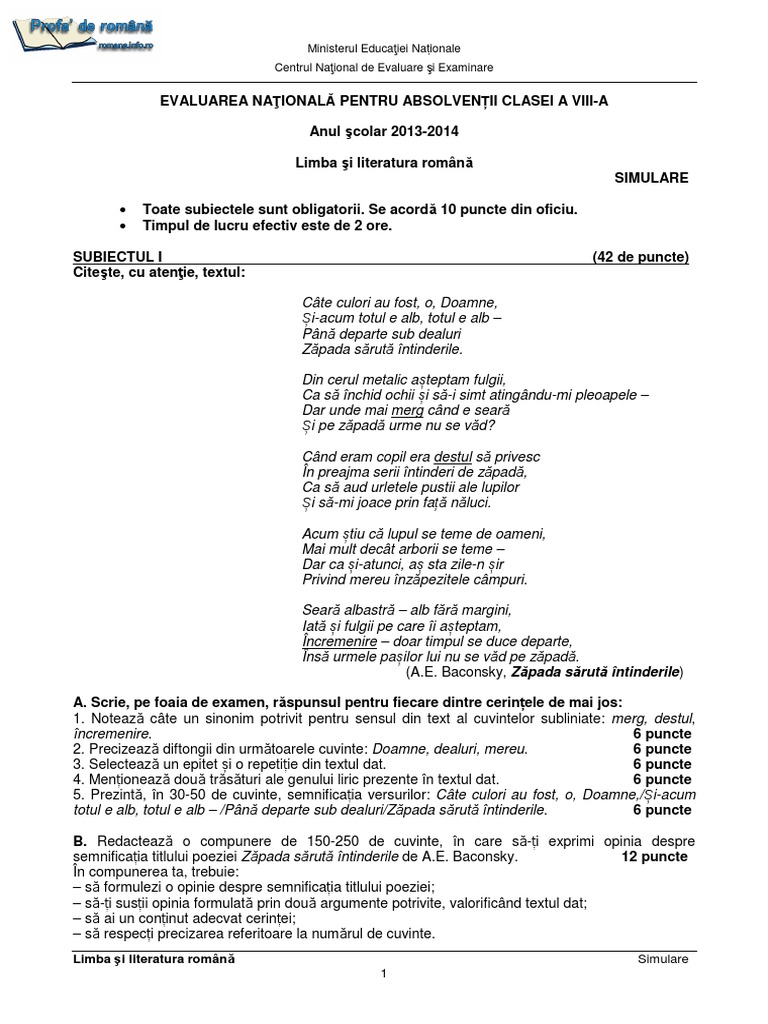 Subiecte Simulare Evaluarea Nationala 2014 Limba Romana