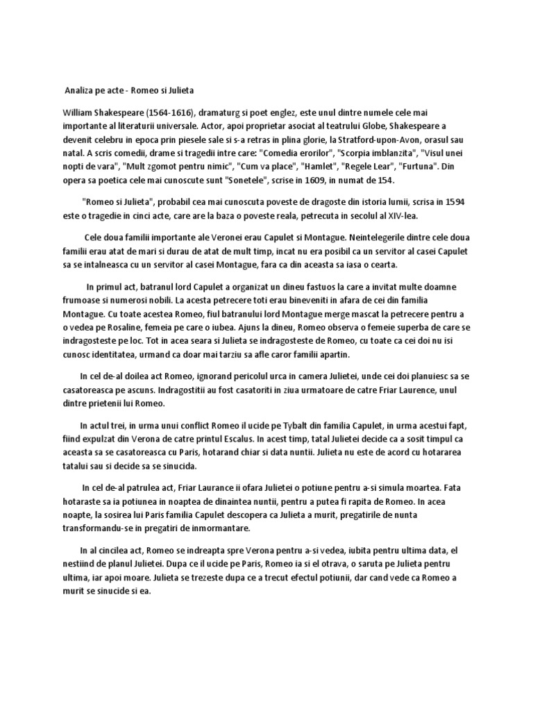William Shakespeare Romeo Si Julieta Rezumat Pe Acte